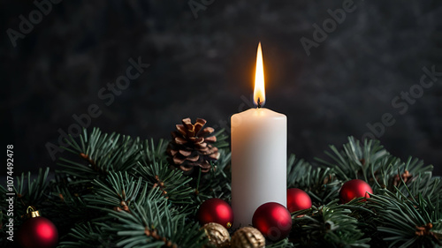 First advent with one burning candle on fir branches with Christmas decoration with grey background copy space.
