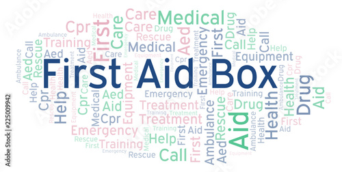 First Aid Box word cloud, made with text only.