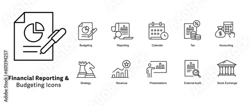 Annual financial icons. Business year vector icons. Editable Stroke.