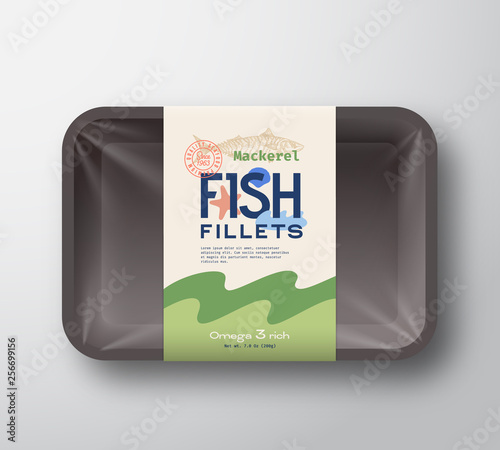 Fish Fillets Pack. Abstract Vector Fish Plastic Tray Container with Cellophane Cover. Packaging Design Label. Modern Typography Hand Drawn Mackerel Silhouette with Colorful Elements Layout.