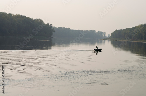 Fisherman are swiming on the boat. Wide river flowing across green forest. Fall. Evening. Reflections of trees in the calm water. Sundown