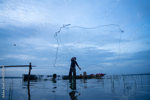Fisherman casting his net at sunrise. Silhouette Asian fisherman on wooden boat casting a net in the Lake. Vietnamese Fisherman throwing net.