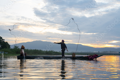 Fisherman casting his net at sunrise. Silhouette Asian fisherman on wooden boat casting a net in the Lake. Vietnamese Fisherman throwing net.
