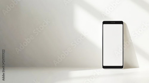 Fisheye angle minimalist photo of a frameless smartphone with a blank screen, isolated on a soft monochrome background with elegant shadows