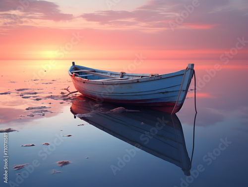 Fishing boat on the water at sunset. Beautiful nature background.