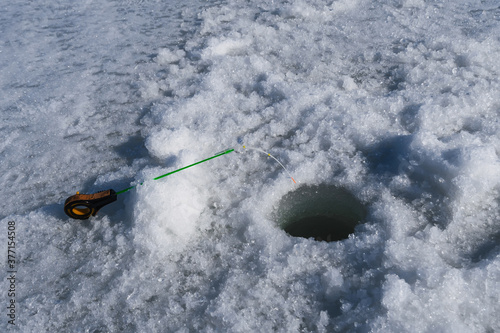 fishing rod for winter fishing is on the ice next to the drilled hole
