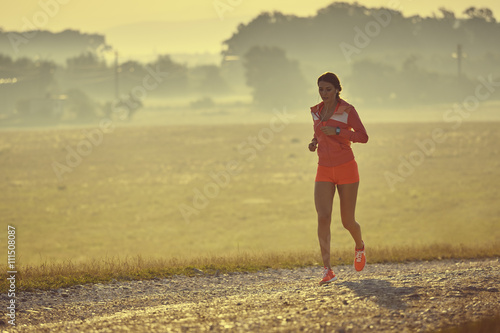 Fit young lady in red summer sportswear running, jogging on a country road while listening to music in earphones, early in the morning. Calories burning. Health care. Willingness concept.