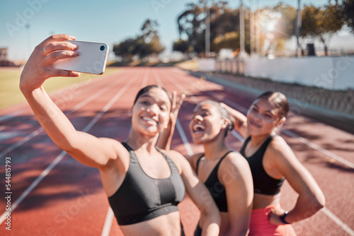 Fitness, selfie and athletes training on a track for a marathon for health, wellness and exercise. Sports, smile and happy friends taking a picture with a smartphone after a workout on a field.