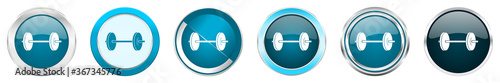 Fitness silver metallic chrome border icons in 6 options, set of web blue round buttons isolated on white background