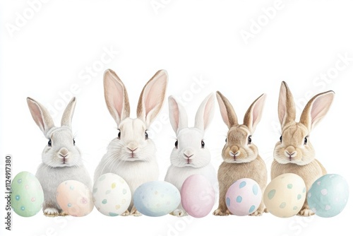 Five adorable rabbits sitting behind colorful easter eggs, creating a delightful springtime scene