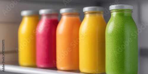 Five colorful bottles filled with different juices are placed on a shelf. Vibrancy, freshness, variety
