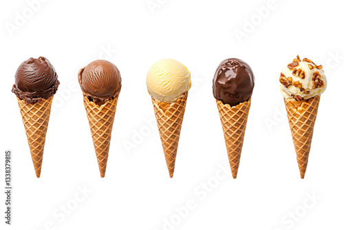 Five delicious ice cream cones with different flavors, including chocolate and vanilla, are arranged in row, showcasing variety of textures and toppings