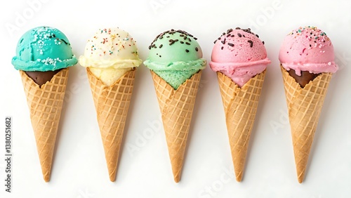 Five delightful ice cream cones in pastel colors a refreshing summer treat perfectly arranged on a white background each with unique sprinkles