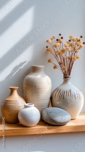 Five elegant concrete and stone bottles of varying sizes are arranged on a shelf with dried flowers and plants