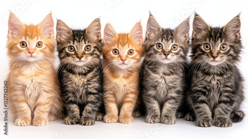 Five Fluffy Kittens in a Row on a White Background. Group of Playful, Cute Baby Cats Posing