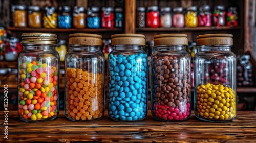 Five glass jars filled with colorful candy-coated chocolate pieces, displayed on a rustic wooden counter.