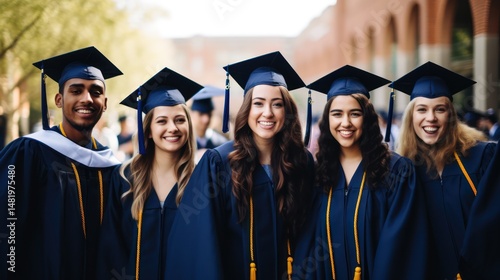 Five graduates in caps and gowns standing in front of a university building.