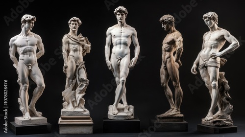 Five marble statues of nude men stand in a row against a black backdrop. The statues are different poses.