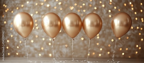 Five metallic gold balloons against a bokeh background.