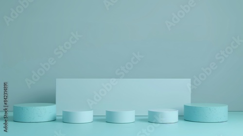 Five Minimalist Blue Toned Round Podiums for Product Presentation on Empty Background. Ideal for E-commerce and Advertising Displays, Showcasing Minimalist Style and Elegance