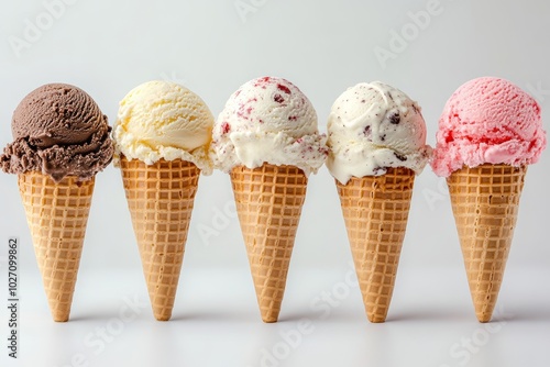 Five scoops of ice cream in waffle cones, arranged in a row on a white background.