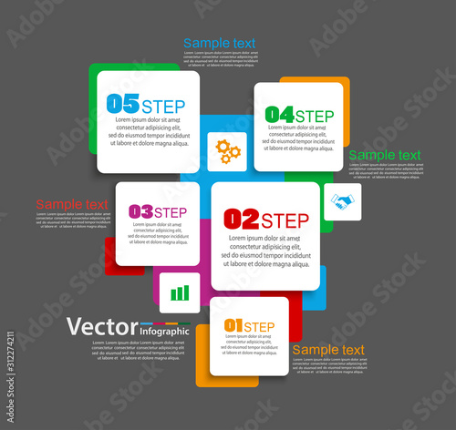 Five steps infographics with colorful squares on black background . Vector chart, diagram, graph with steps, options, parts, processes with square elements. Vector business