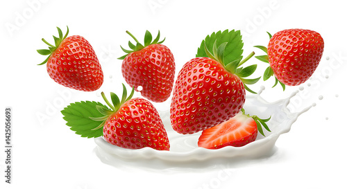 Five strawberries with green leaves and a splash of milk on a black background close up view image