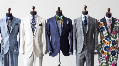 Five Tailored Suits on Mannequins Displayed in a Row