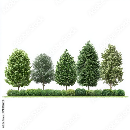 Five trees of varying types with green bushes isolated on white background