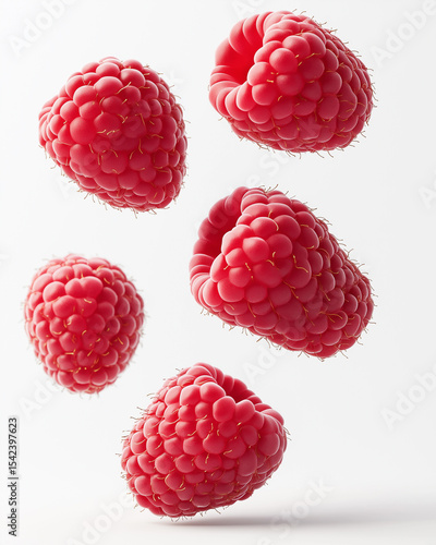 Five vibrant, fresh red raspberries are suspended in mid-air against a clean white background, showcasing their intricate textures and rich color.
