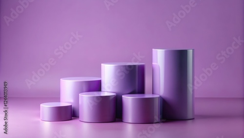 Five violet cylindrical stands on light purple background for product showcasing, product showcase, retail display