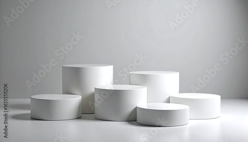 Five white cylindrical platforms arranged asymmetrically on a white floor against a white wall, lit by a subtle light source