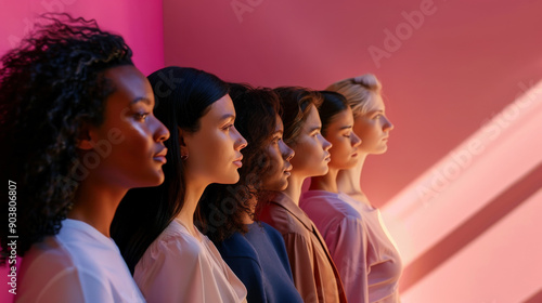Five women of varying ethnicities stand in profile against a vibrant pink and purple background, exemplifying unity and diversity.