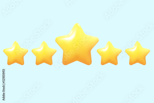 five yellow stars glossy colors. Achievements for games. Customer rating feedback concept from client about employee of website. Realistic 3d design. For mobile applications. Vector illustration