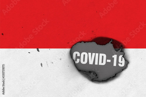 Flag of Indonesia with burned out hole showing Coronavirus name in it. 2019 - 2020 Novel Coronavirus (2019-nCoV) concept, for an outbreak occurs in the Indonesia.
