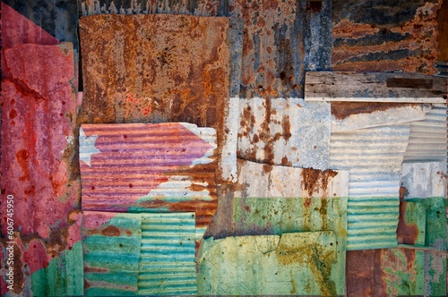 Flag of Jordan on rusty corrugated iron sheets forming a wall or a fence