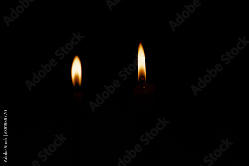 Flame from 2 burning candles close-up in absolute darkness. Flame overlay for Photoshop. Fire on an isolated black background for editing and design.