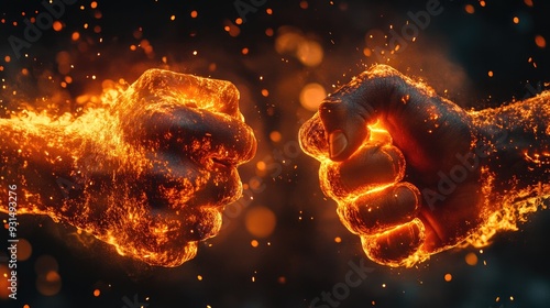 Flaming fists colliding in a symbolic battle, with flames and sparks flying, representing conflict and struggle.