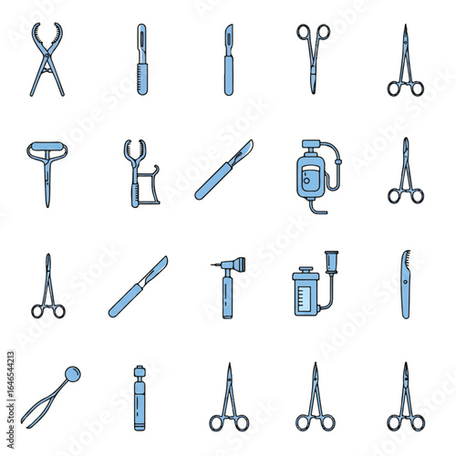 Flat 2D vector set of twenty surgical instrument icons, featuring retractor, needle holder, scalpel, suction tube, and surgical scissors, on a clean white background.