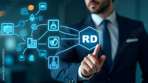 Flat Businessman Engaging with R&D Icons on Digital Interface: A Cute Vector Illustration of Innovation Technology and Human Resources for Strategic Growth