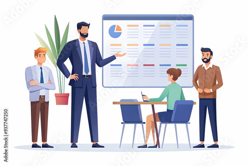Flat Candid moment of a project manager updating a team on project status concept as A candid shot of a project manager updating their team on the status of a project. The camera captures the managers