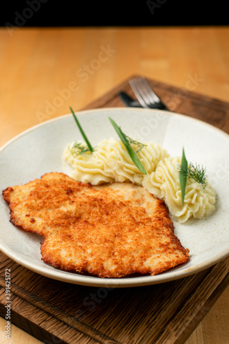 Flat, crispy golden schnitzel with beautifully served mashed potato on a wide white plate on a wooden pub table