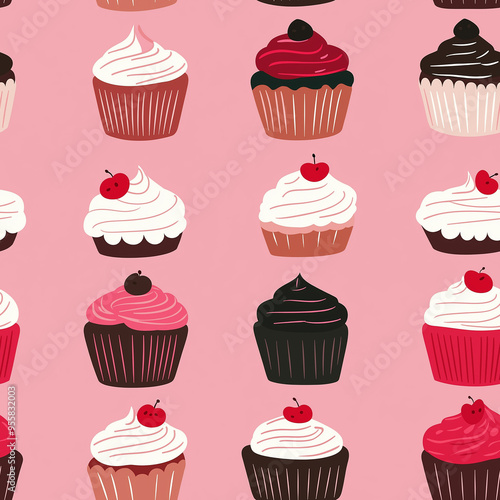 Flat design seamless pattern with cupcakes with frosting. Pink background