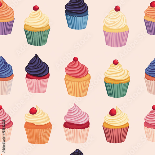 Flat design seamless pattern with cupcakes with frosting. Pink background