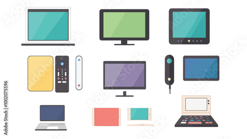 Flat Design Vector Set of Modern Digital Devices Including Laptops, Tablets, Smartphones, Monitors, and Remote Controls for Technology and Electronics Concepts