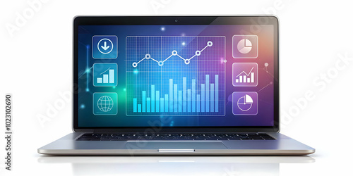 Flat Glossy Laptop with Holographic Branding Icons | Close-Up Shot of Digital Marketing Campaign Metrics | Isolated Design on White Background for Branding and Advertising Content