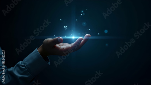Flat Hand interacting with holographic device creating dark mode digital wallpaper with empty space background concept as A hand using a holographic device to design dark mode digital wallpapers empha