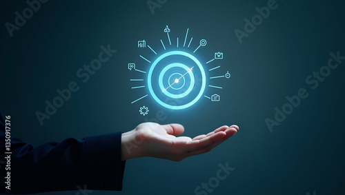Flat Hand presenting holographic targeting icon symbolizing sales targeting in marketing within empty space background concept as A hand showcasing holographic targeting icon representing sales target