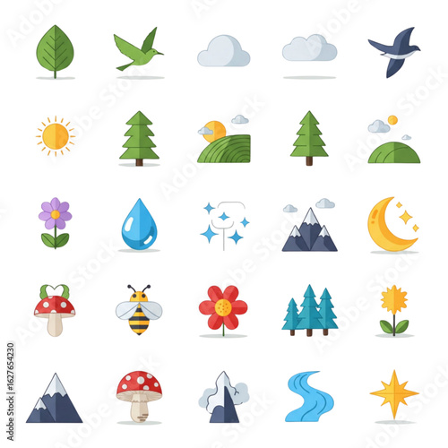 Flat illustration collection depicting natural elements like leaves, animals, landscapes, weather, and wildlife. Nature graphics for design projects