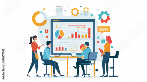Flat illustration depicting a modern business scene for a website hero section. It features professionals engaged in discussion, charts, and graphs, with a minimalist design and a vibrant colors.